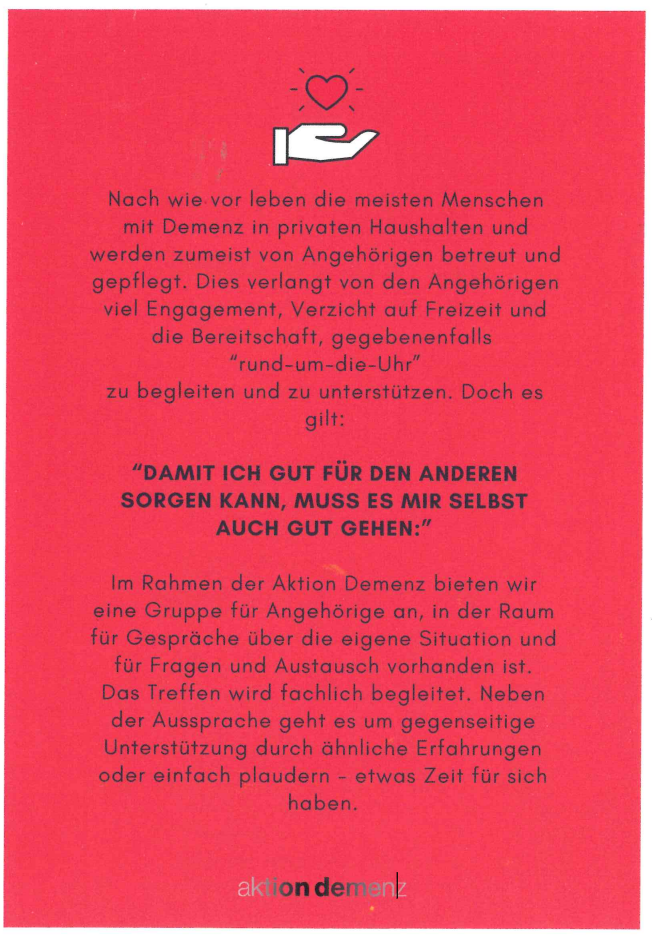 In Kooperation mit dem Mobilen Hilfsdienst und den Krankenpflegevereinen öffnet die Aktion Demenz einen Raum, in dem alle Gäste sein dürfen wie sie sind. Im Vordergrund stehen die Gemütlichkeit und der Austausch untereinander und die Freude an gemeinsamen Themen.